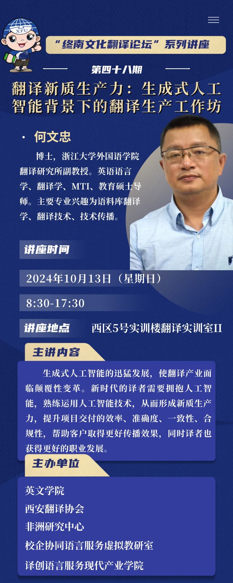 主题:“终南文化翻译论坛”系列讲座第四十八期——翻译新质生产力:生成式人工智能背景下的翻译生产工作坊