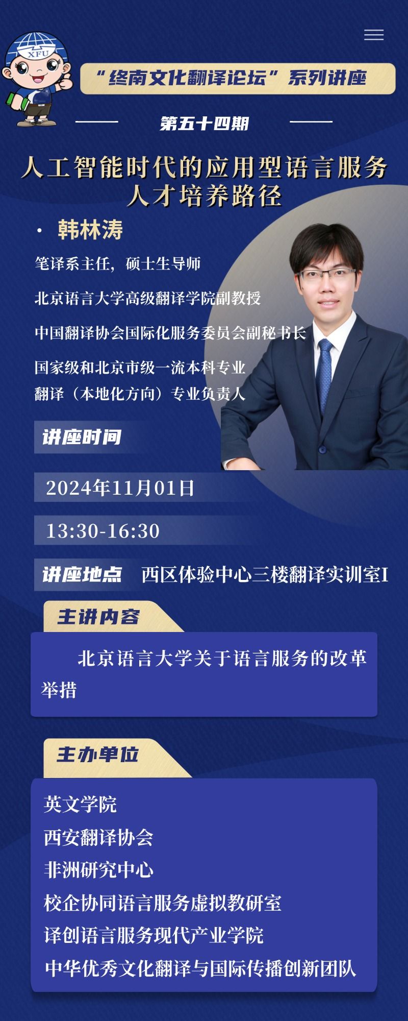 主题:“终南文化翻译讲坛”系列讲座第五十四期——人工智能时代的应用型语言服务人才培养路径