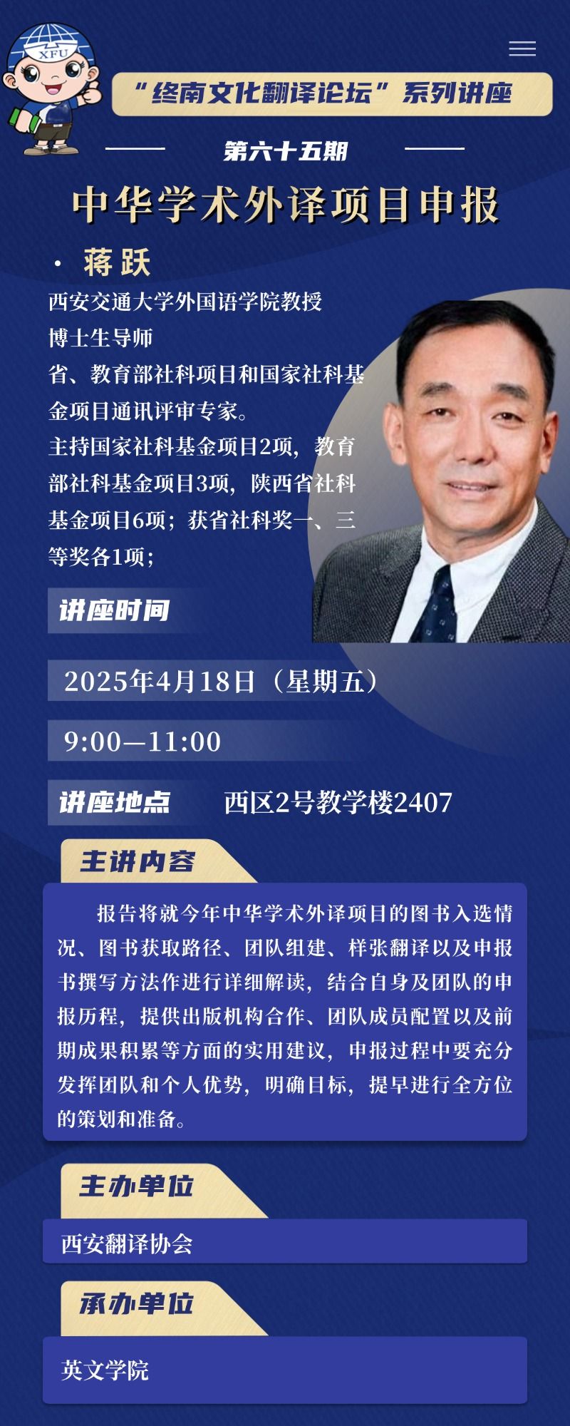 主题:“终南文化翻译讲坛”系列讲座第六十五期——中华学术外译项目申报