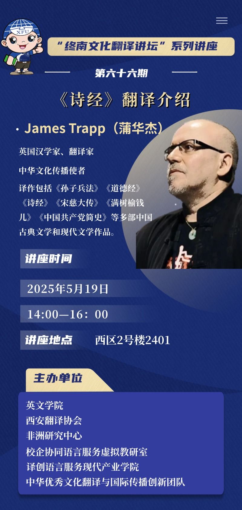 主题:“终南文化翻译讲坛”系列讲座第六十六期——《诗经》翻译介绍