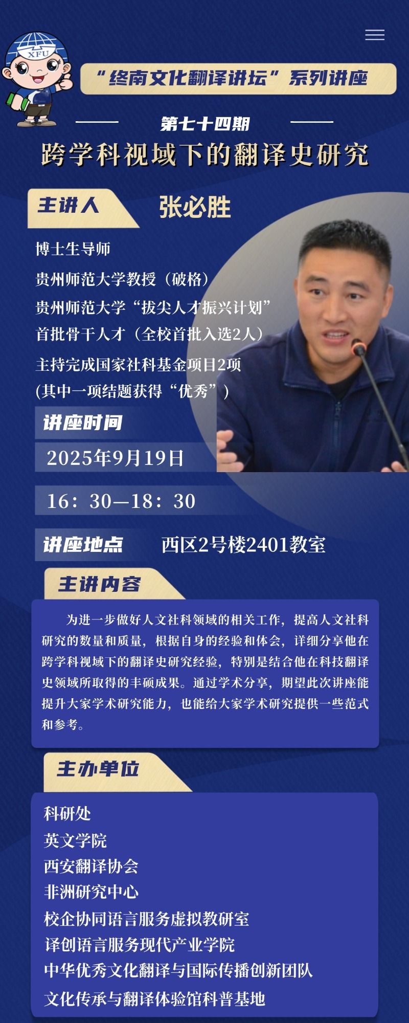 讲座主题:“终南文化翻译讲坛”系列讲座第七十五期——外国语言文学学科发展的实践与探索