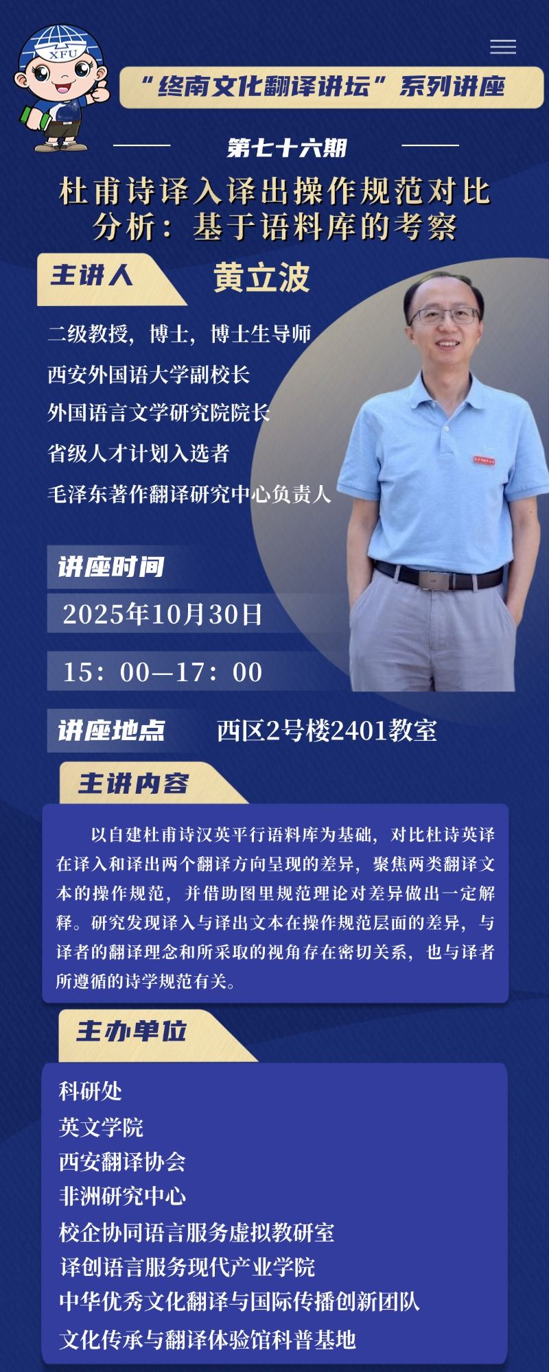 讲座主题:“终南文化翻译讲坛”系列讲座第七十六期——杜甫诗译入译出操作规范对比分析:基于语料库的考察
