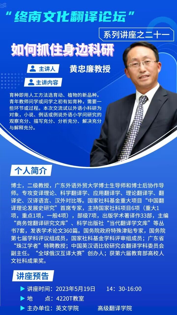 讲座主题:终南文化翻译系列论坛系列讲座--如何抓住身边科研