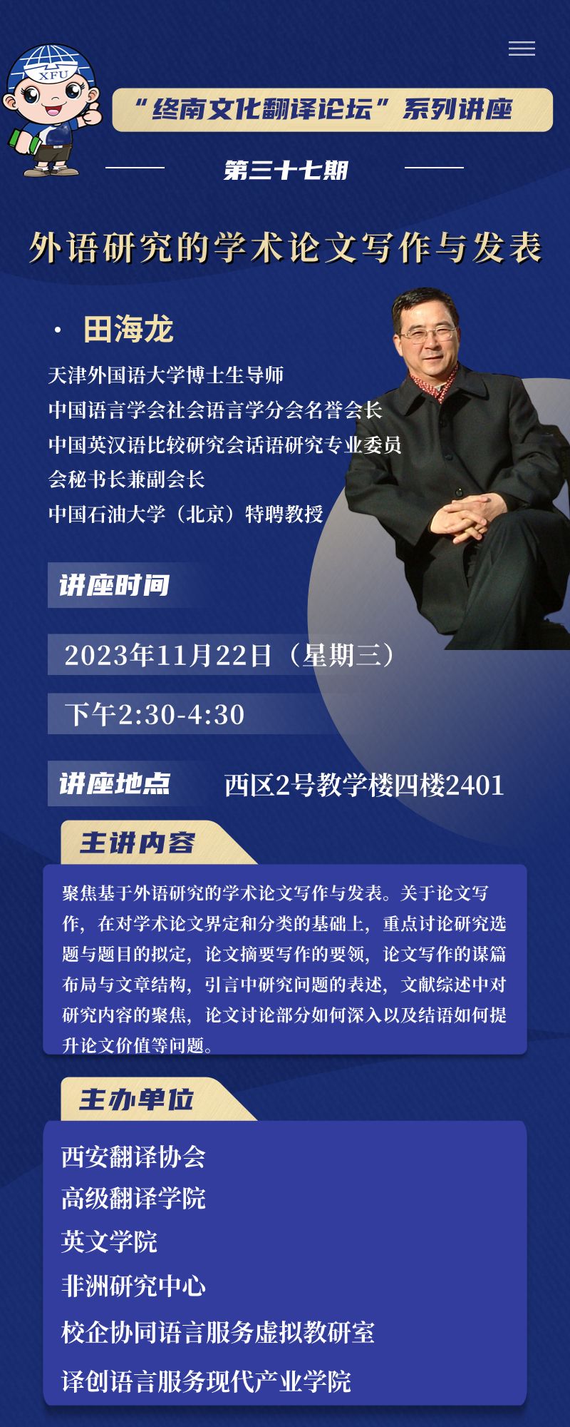 讲座主题:“终南文化翻译论坛”系列讲座第三十七期——外语研究的学术论文写作与发表