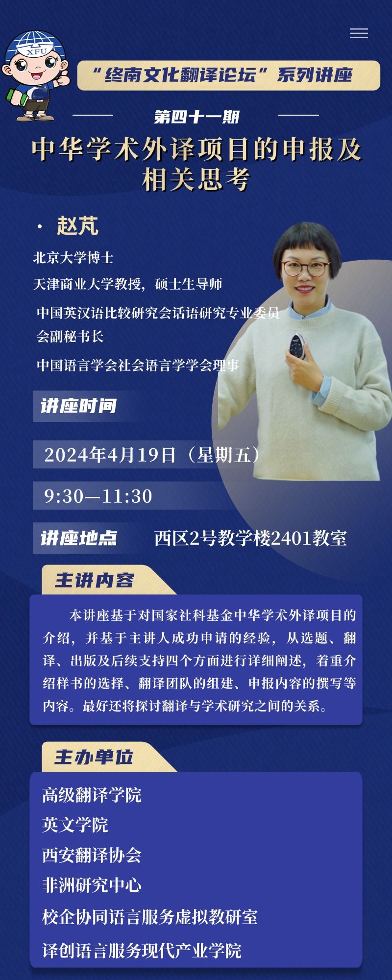 讲座主题:“终南文化翻译论坛”系列讲座第四十一期——中华学术外译项目的申报及相关思考