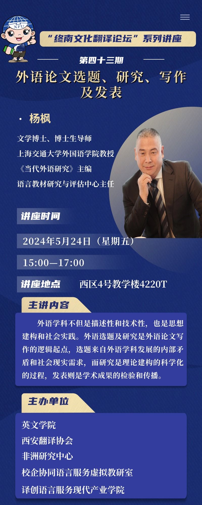 讲座主题:“终南文化翻译论坛”系列讲座第四十三期——外语论文选题、研究、写作及发表