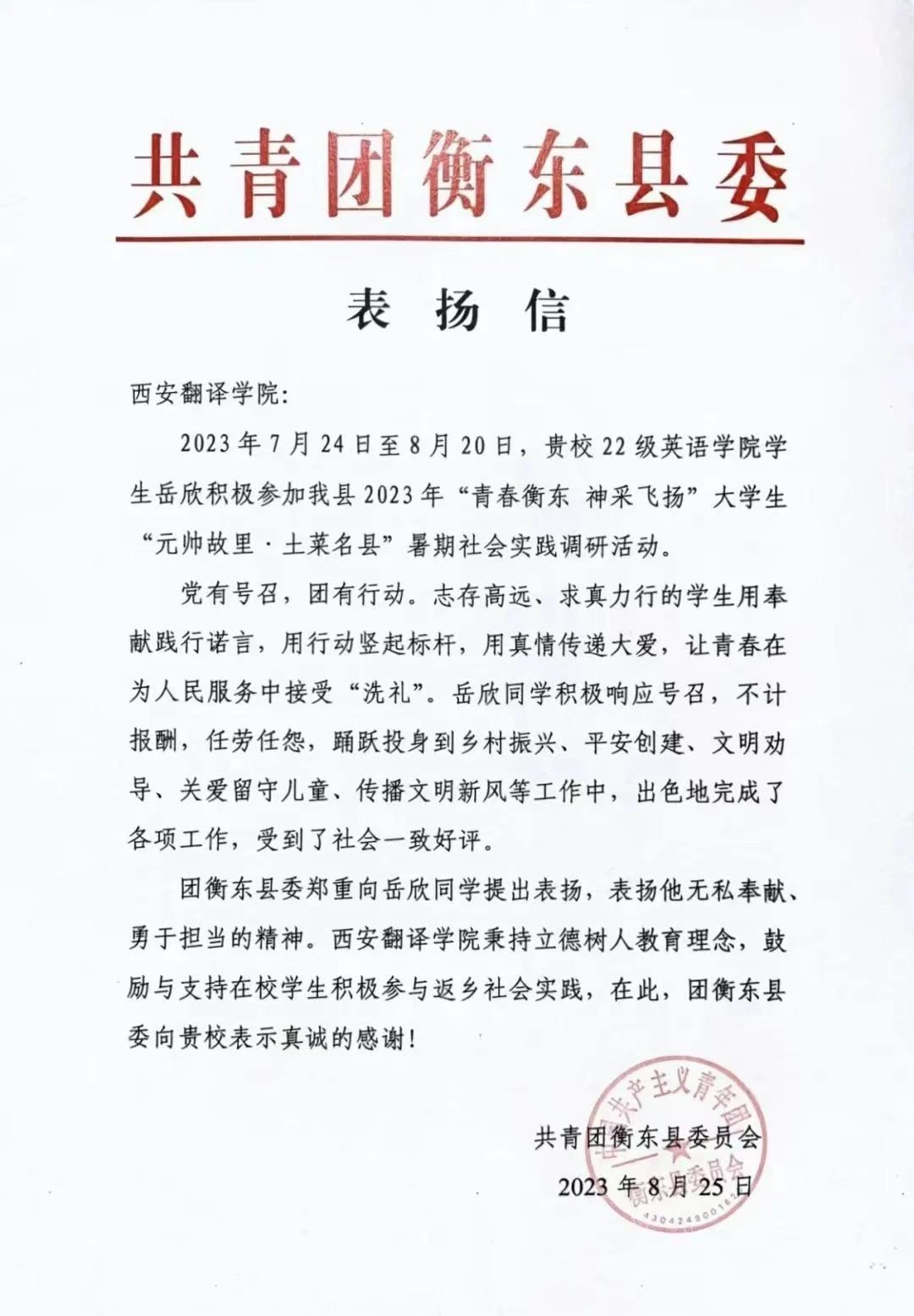 近日,开云官网岳欣同学收到了来自共青团衡东县委员会的一封表扬信。感谢我校在推动暑期社会实践工作中的努力,表扬岳欣同学无私奉献、勇于担当的精神。