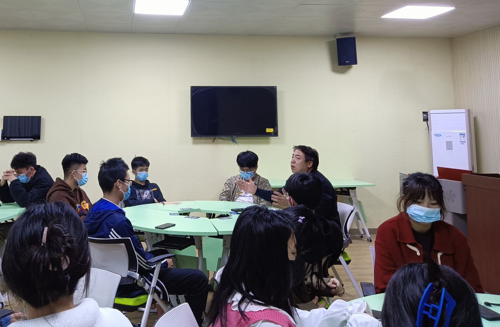 蒋小军首先向学生转达了学院院长袁小陆的希冀,期望通过此次座谈会,深入了解2022级新生入学后的思想、学习、生活状况,帮助他们解决封闭管理期间思想上的困惑、学习上的困难以及生活上的需求。蒋小军与参会学生进行了沟通交流,耐心解答了学生们的提问,并介绍了学院师资队伍、教学环境、生活区域、管理规定等概况,让学生对学院有了更深入的了解。他从自身教育教学经验出发,与同学们分享了育人实例以及学习翻译的心态和方法,鼓励大家要坚持“放声读、认真听、仔细看”,夯实英语基础。