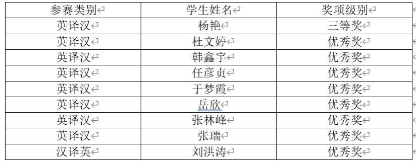 赛中表现出众,取得了有史以来最好的成绩,荣获多项奖项。其中“英译汉”组三等奖1名,优秀奖7名;“汉译英”组优秀奖1名;“日译汉”组优秀奖2名,他们分别是: