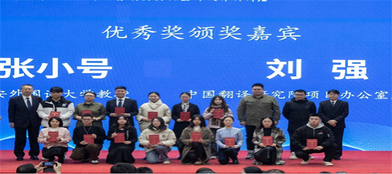 西安外国语大学高翻学院副院长张小号、中国翻译研究院项目办主任刘强为我校优秀奖获奖学生代表刘洪涛、任彦贞颁发证书