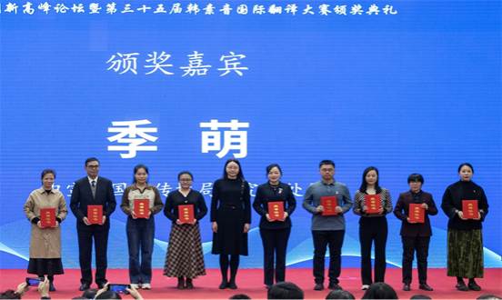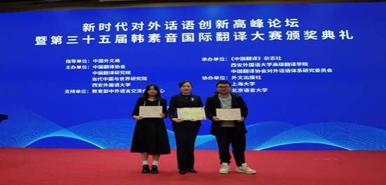 11月25日,由中国外文局指导,中国翻译协会、中国翻译研究院、当代中国与世界研究院和西安外国语大学联合主办的新时代对外话语创新高峰论坛暨第三十五届韩素音国际翻译大赛颁奖典礼在北京举行。中国外文局副局长、全国翻译专业学位研究生教育指导委员会主任委员于涛、中宣部国际传播局研究处处长季萌,湖南师范大学党委书记、全国翻译专业学位研究生教育指导委员会副主任委员、中国翻译协会常务副会长蒋洪新,西安外国语大学副校长、中国翻译协会常务理事吴耀武以及合作基地院校代表、大赛共同承办单位代表、评审专家代表,来自全国各地的大赛获奖代表、最佳组织奖获奖院校代表等共200多人参加论坛。西安翻译协会副理事长方馨代表我校出席颁奖典礼。当代中国与世界研究院副院长范大祺主持开幕式与主旨发言。