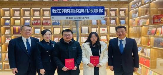 中国外文局中东欧与中南亚传播中心(人民画报社)主任、中国翻译协会副会长姜永钢,中国翻译研究院项目办主任刘强,西安翻译协会副理事长方馨和我校获奖学生代表刘洪涛、任彦贞合影留念
