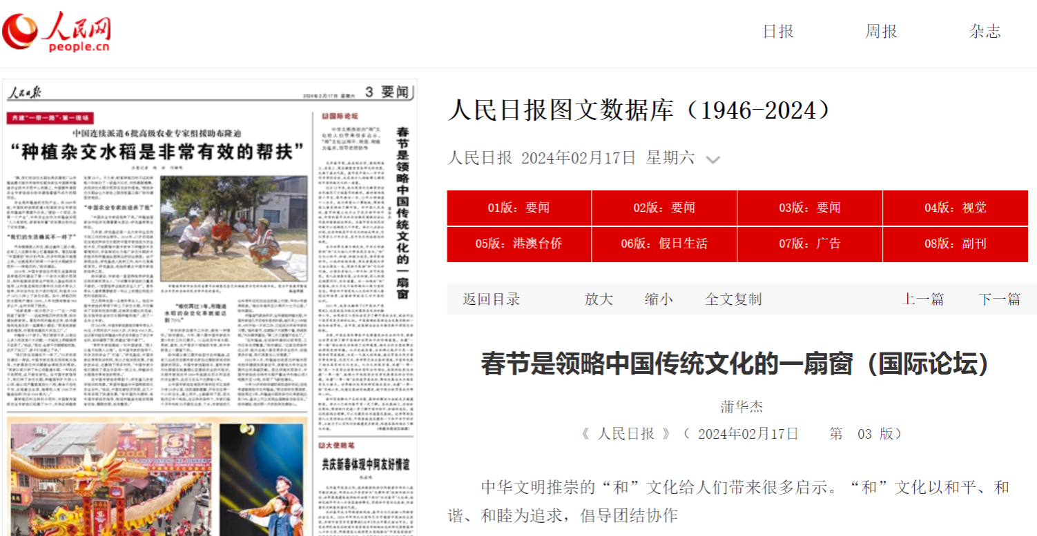 文章中,普华杰首先介绍了春节在中国文化中的重要地位,指出春节是中国人一年中最重要、最盛大的传统节日,更是一个文化的载体,是人们领略中国博大精深传统文化的一扇窗。他强调中华文明推崇的以和平、和谐、和睦为追求,倡导团结协作的“和”文化给人们带来很多启示。蒲华杰谈到了他通过翻译的《中国共产党简史》,对中国政治史有了更多的认知,他说中国强调政策理念与发展实践的一致性和连贯性,并且政策理念会在长期实践中得到充分检验。他以“一带一路”倡议为例,介绍了中国在维护世界和平,促进国际合作、交流互鉴中的积极努力。