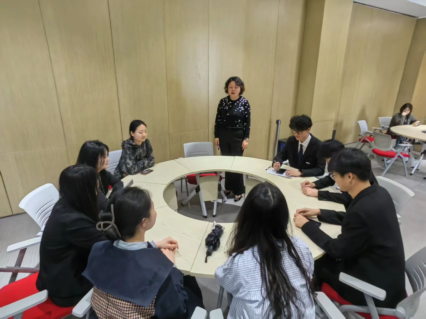 遴选当天,现场氛围既紧张又热烈。李燕老师负责维持现场秩序,穿梭在人群中,时刻关注着每一位同学的状态。看着同学们紧张又期待的眼神,她主动上前轻拍肩膀,安慰他们放轻松,把这次面试当作一次展示自己的机会,发挥出自己的真实水平就好。在她的鼓励下, 不少同学逐渐放松下来,脸上重新露出了自信的笑容。当看到同学们在面试中自信地展示自己,李燕老师也由衷地为他们感到高兴。